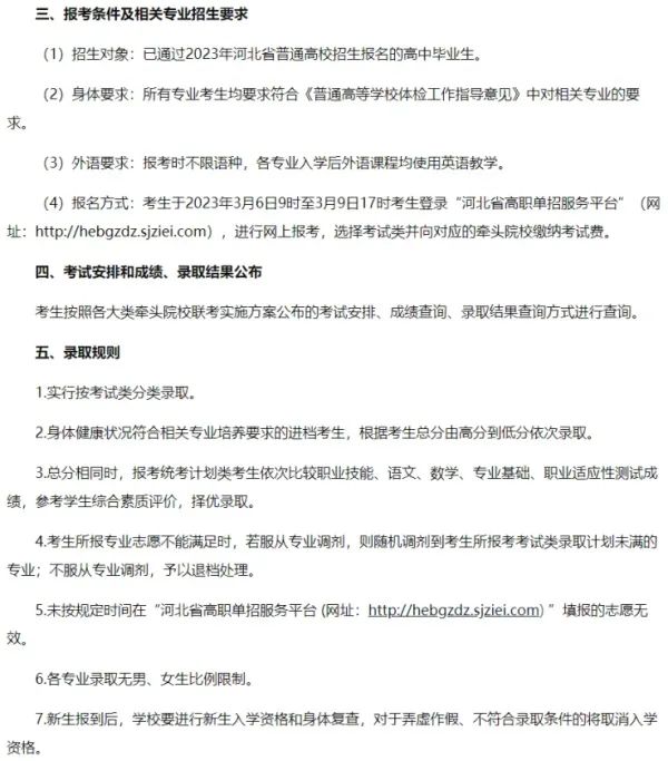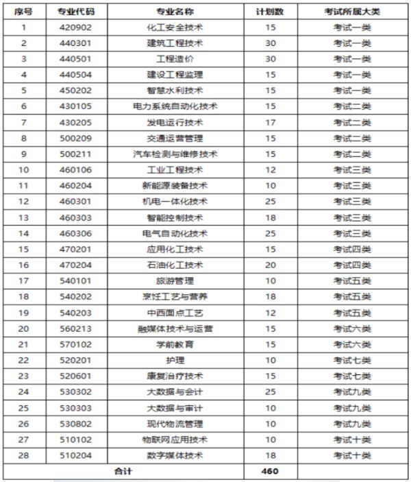 2023年学院在河北单独招生专业28个,计划460名,以下为分专业招生计划: